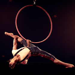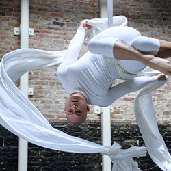 Joey is a visually stunning aerialist known for his strength and graceful movement. On stage a good part of his life by way of performance groups, he has naturally taken to the skies. He performs on a variety of apparatus, specializing on dance trapeze and aerial straps. He has trained at the San Francisco Circus Center as well as Chez Victors’ and L’Acadamie du Monastere in Montreal. He is a resident artist at Berber in SF, co-directed “Circus Pop Ups” as well as produces and directs the fundraiser “Spectrum”. Other performance highlights include: Montreal Completement Cirque, medalist at De Leon Cirquefest, Circus Bella, Cirquantique, Lunar Circus and Cirque de Boheme. He currently teaches and performs around the San Francisco Bay Area.